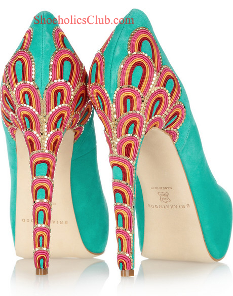 Brian Atwood Embroidered heel pumps accents a bold hue with gorgeous multicolor embroidery trimmed with golden beads. We certainly are in love with these very vibrant and statement making design. It’s almost too good to wear, perfect as a display on a mantle. Beautiful!