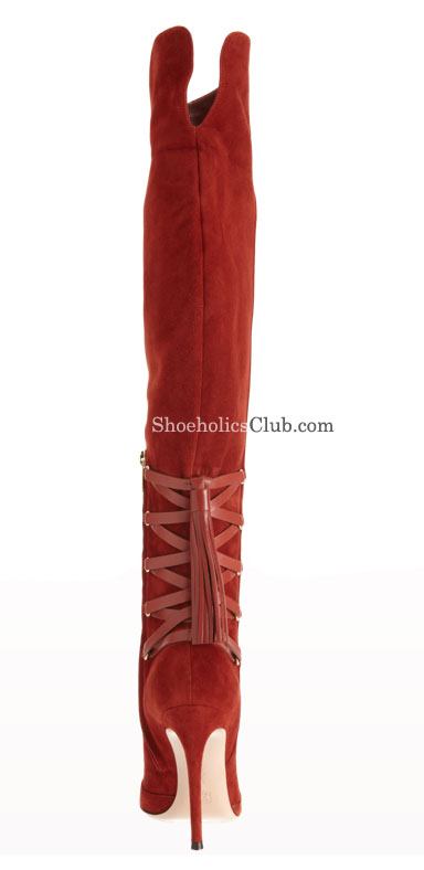 Who says Fall season has to be dull with no sex appeal? Italian designer Gianvito Rossi begs to differ by offering up suede high-heeled boots in solid Fall season color with narrow toe line and  back lace-up tassels. These would look great with a nice dress, skirt or tucked in jeans. Bellissima!