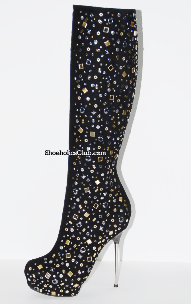 Grommet embellished suede knee length boots my Italian designer, Massimo Dogana. Did we mention the soles are made of radiant pearlized pink color? So cute. Get ready for winter in style!