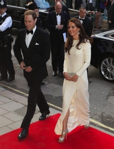 Kate Middleton escorted her husband, Prince William to the Claridge’s Hotel in London yesterday where he was honored by the Thirty Club. She graced the affair with a long ivory dress by Roland Mouret complete with a pair of strappy glittery Jimmy Choo sandals. Could this fresh new approach to sexy shoes be her response to Nicholas Kirkwood’s statement about her shoes being too…you know…matronly? Whatever it is, we certainly love this new look.