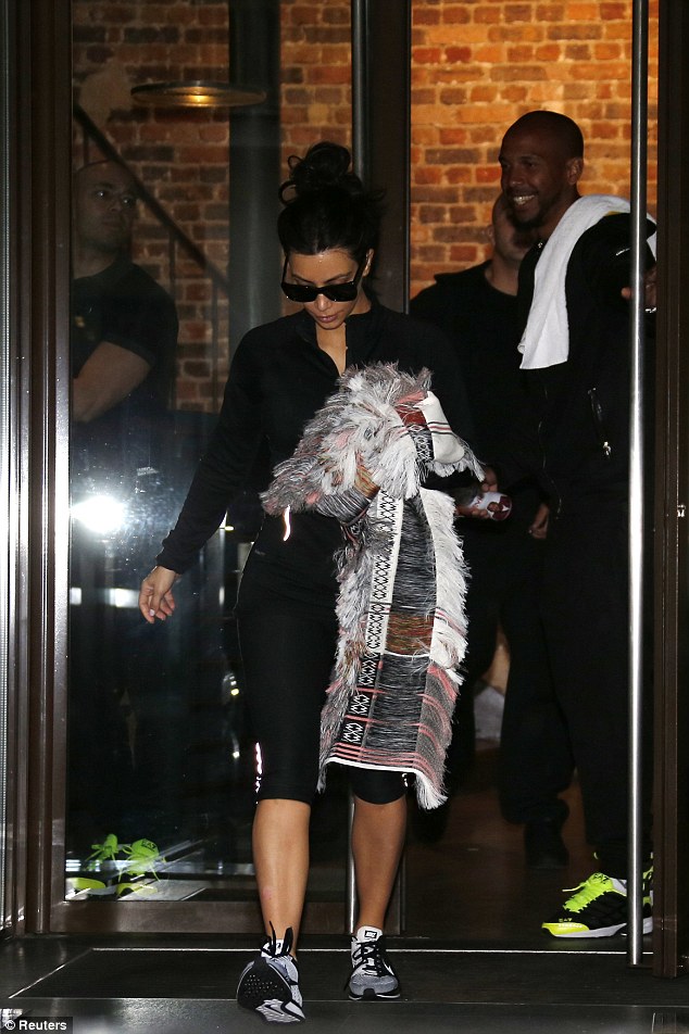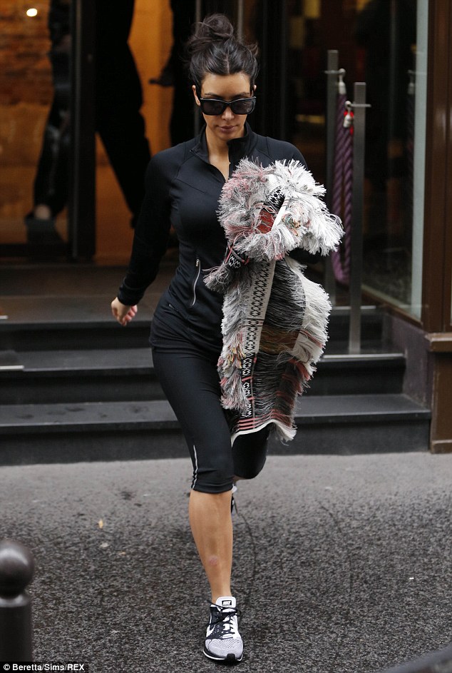 Our sneakerhead members would appreciate this on Kim Kardashian who is in Paris right now getting ready for her pending nuptials to Kanye West. The blushing bride was spotted working out in a gym 3 times in a row within a week, obviously determined to fit into her wedding gown on her big day. We love her color coordinated gym ensemble of black and white. Staying chic while sweating is the way to do it! Shortly after the workout session, she was seen in a favorite strappy gold chain sandals featured further below.