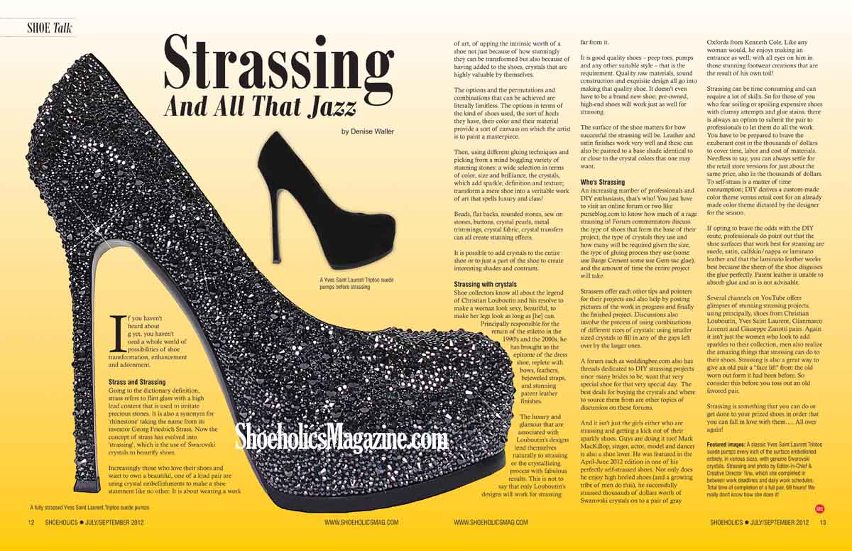 The July-September 2012 issue introduces our readers to the unique world of Strassing, the art of transforming old (and sometimes new) shoes into a rare gem with dazzling embellishment of high grade crystals for continued sparkle, adding a new life to the shoes.